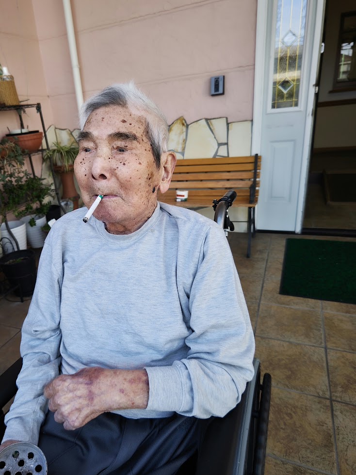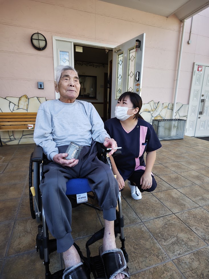 体調も落ち着いていらっしゃるし、外に出て気分転換しましょう。そう、利用者様の大好きなたばこを吸いに。