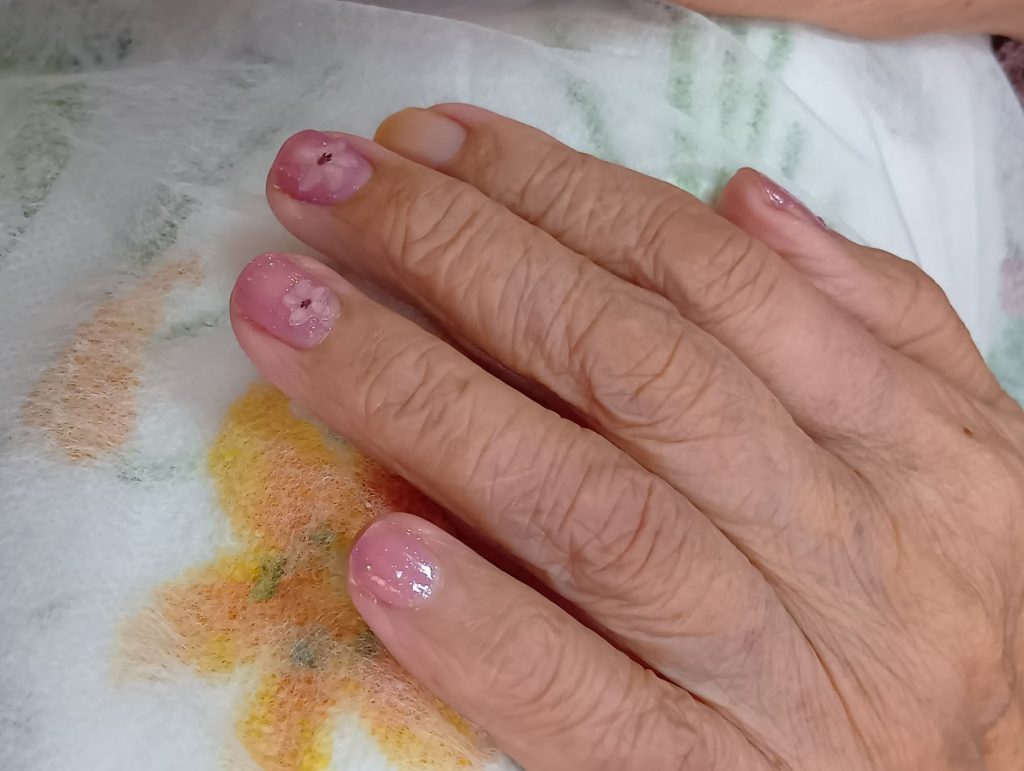 今回は、お水で落とせるネイルを使用しています。また、酸素飽和度の測定に問題がないように、指1本はネイルを省いて。