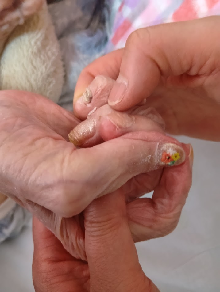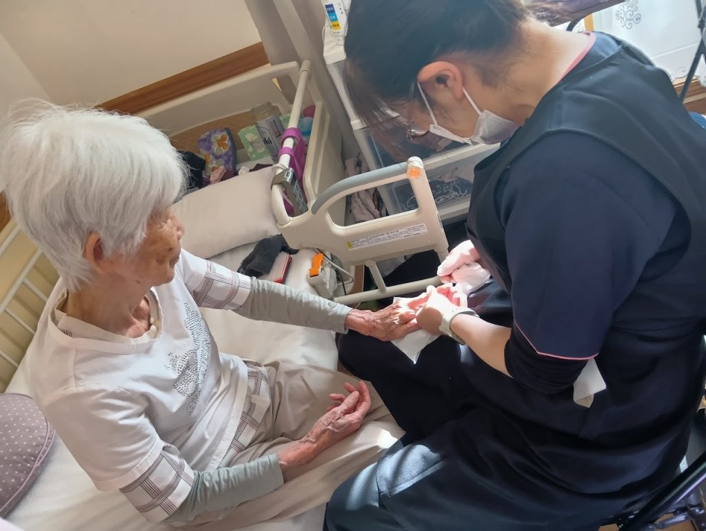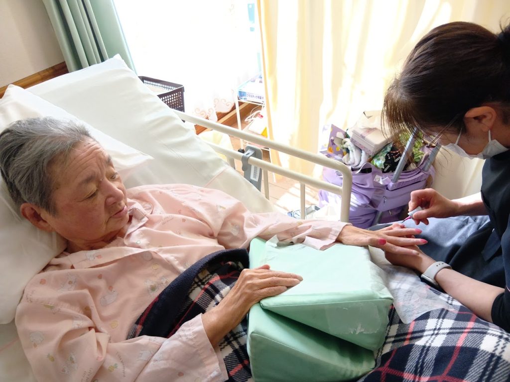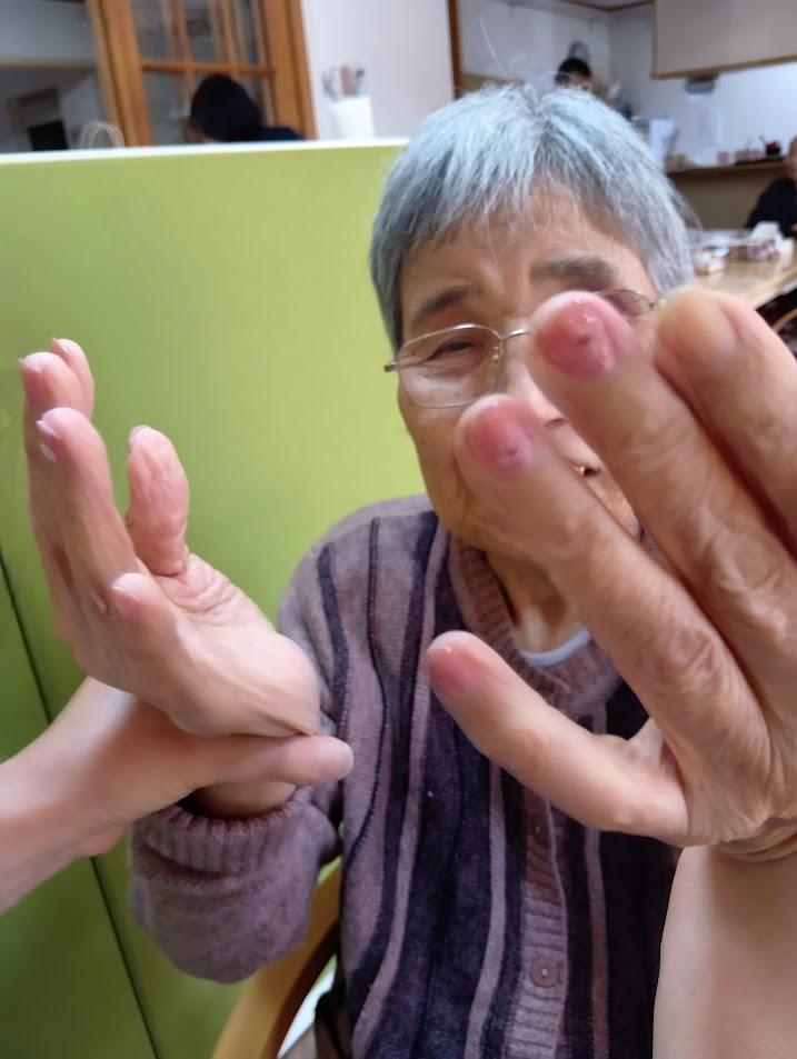 さすが、専門的な訓練を受けたセラピストです。お爪のお手入れがむずかしかった方にも、削ったり、磨いたり、整えたり。