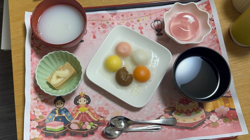 外はあいにくの雨で残念😢…ですが品川施設ではひな祭りを少しでも楽しんでいただくため、食事レクを行いました😊